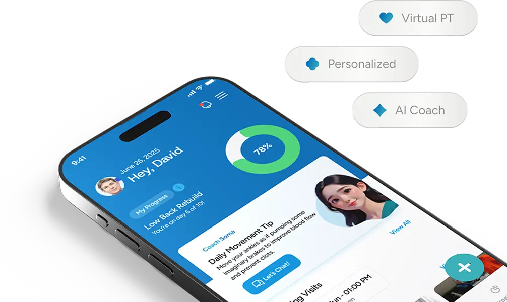 Patients can connect with licensed physical therapists directly through the Somatic Health app for virtual consults, movement assessments, and ongoing guidance. This on-demand access provides expert support between visits, helping patients stay on track, address setbacks, and progress with confidence.